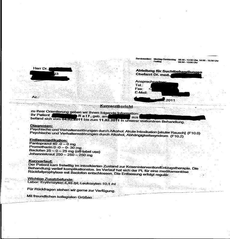zu 1. : Zu der Bac-Therapie ist mir in einer Suchtklinik bei meinem vorletzten Entzug in Mitte Dez. geraten worden. früher war Campral dort mal "das" Mittel. Der Arzt sagte, ich solle das mal testen hätten andere Pat. gute Erfahrungen mit gemacht... Campral wird anderen aber auch noch verordnet ! jetzt kleine Anekdote : also 2-0-2 (off label use). Tabletten!!! der Doc ging hier von 10mg aus,hat aber ein Rezept mit 25mg verschrieben..ich sollte langsam 1-0-1 und dann erhöhen... als ich dann 2-0-2 (25 mg) genommen hab, kam Kopfschmerz,leichte Übelkeit,Benommenheit. so bin ich durch"googlen dann zu Euch gekommen und hab die Medikationsmengen anderer gelesen. war nichts schlimmes weiter, hab dann 25-0-25 genommen. vor Antabus,-wird viel angegesetzt-und ambulant gegeben,hatte ich immer Angst. - Rücktür,-saufen..??? Mitte Jan. Gespräch mit Doc, alles ok,(Klinik und Namen uninteressant) soweit so gut. zu 2. Hab dann mit mal ein Bier abends versucht... einahme von Bac dann irgendwann nur noch morgens... dann statt Baclofen Bier schon morgens... ca. eine Woche, bis dann nur Bier +Starter+Kippen ,,,-nichts mehr essen -,zur alten Situation führten. kürzer war der Absturz,milder nicht unbedingt.Aber vom Versagen her sehr schwer. Kopf unter den Arm,wieder rein... (Anfang Febr.) diesmal in voller konsequenz : auch nicht mal mehr ein kleines Bier. über Sylvester war ich ja auch stark, kein Interesse, trotz Böllern und Angebot von Nachbarn,-"auch ein Bier". Mir geht es physisch sehr gut !!! kein Craving, Suchtgedächnis - ist nichts von da.....-na ja, ist ja auch noch alles sehr frisch... Psyche hängt schübeweise mal durch. Ich hoffe, da einen Dreh reinzubekommen. meine Tagesstruktur ist schon wieder im Eimer- 4:30 ins Bett, 10:00 aufstehen... soweit erst mal . lieben Gruß , Ralf.