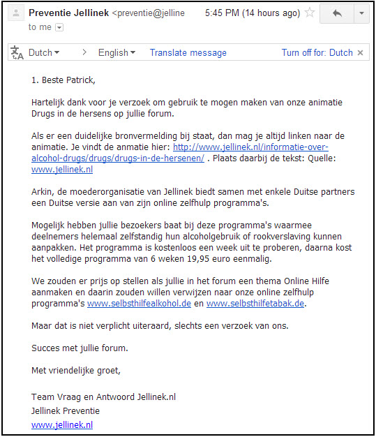 Vielen Dank für Deine Anfrage , unsere Animation „Drogen im Gehirn“ auf Eurem Forum zu verwenden.