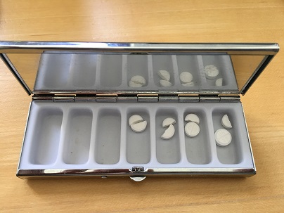 . Deswegen habe ich 1. den Handywecker gestellt und 2. eine Medikamentendose mit 7 Fächern mit meinen am Vorabend fertig gestellten Tabletten. Diese führe ich stets bei mir.