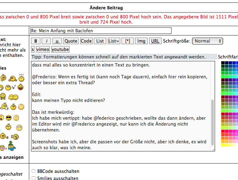Danke  Noch kein feedback von dem "Shop", bis dahin bleibe ich auf max. 2 Bac (10mg)/Tag, ich saufe seit über 20 Jahren, auf eine Woche wird es da auch nicht mehr ankommen. Danach bleibt das Ziel unverändert, mit den 3 Packungen hochdosieren, bis ich es schaffe zum Arzt zu gehen. Ich habe auch schon in einem Texteditor angefangen, meine "Vorstellung" zu schreiben, na ja, es wird wohl etwas mehr, eher ein Outing, auch etwas Weltschmerz-teilen. Evtl. mag es jemand lesen, aber wahrscheinlich hilft es mir, dass mal alles so konzentriert in einen Text zu bringen. @federico: Wenn es fertig ist (kann noch Tage dauern), einfach hier rein kopieren, oder besser ein extra Thread? Edit: kann meinen Typo nicht editieren? Das ist merkwürdig: Ich habe mich vertippt: habe @federico geschrieben, wollte das dann ändern, aber im Editor wird mir @federico angezeigt, nur kann ich die Änderung nicht übernehmen. Screenshots habe ich, aber die passen vor der Größe nicht, aber ich denke, es wird auch so klar, was ich meine. So, noch ein Versuch, diesmal habe ich auf die Größe geachtet, man sieht, dass die falsche Schreibweise im Editor verbessert wird, aber im Text landet es dann nicht. Selbst, wenn ich es jetzt richtig schreibe, (screenshot) passt es nicht. Sorry, hat mich jetzt 10 Min gekostet, muss auch nicht als negative Kritik verstanden werden, nur, ich wollte halt nicht, dass meine Posts als schlampig(er als sie leider eh schon sind, habe beim später lesen erneut Typos gefunden) empfunden werden. Mir ist das Thema _extrem wichtig, ich will keine Leute durch schlechte Lesbarkeit vergraulen.