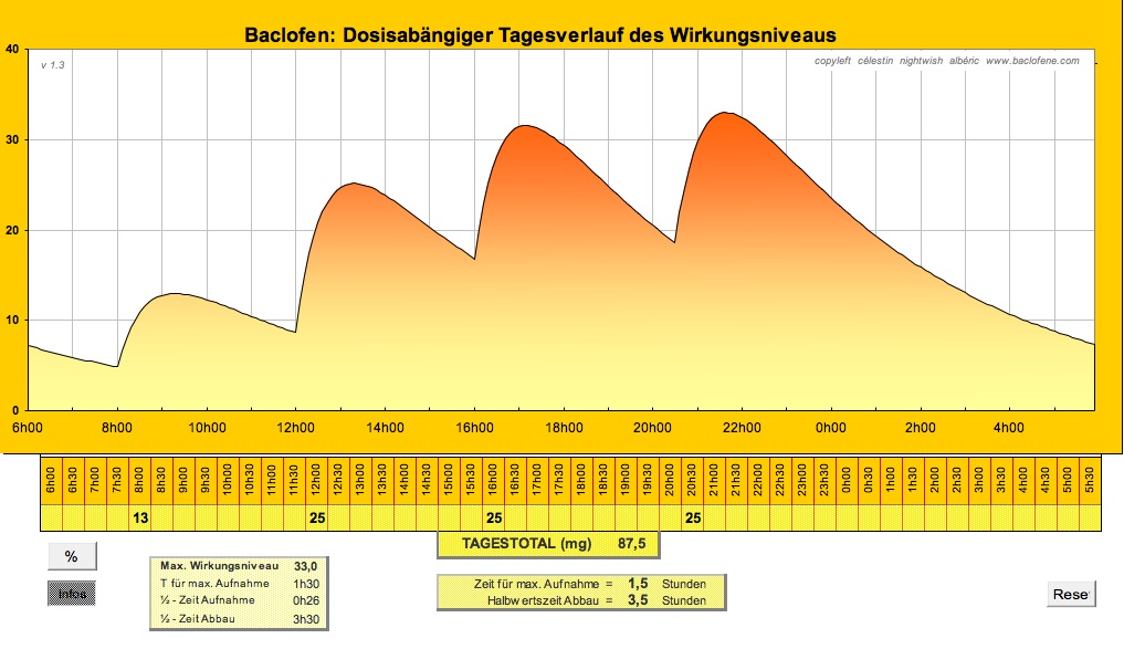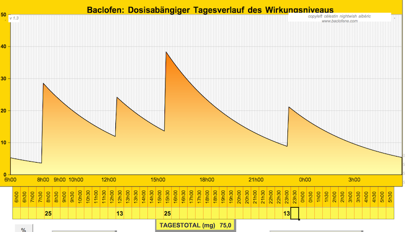 Auffallend ist dabei, wie wenig Schutz diese Verteilung gerade in den Abendstunden bietet. Die Angst reduzierende Wirkung von Baclofen kann sich nur in geringem Maß auf den „Bierdurst“ auswirken. (Angst erzeugt bei uns Craving). So könnte es mit beinahe der gleichen Dosis aber anderer Verteilung aussehen: Dateianhang: