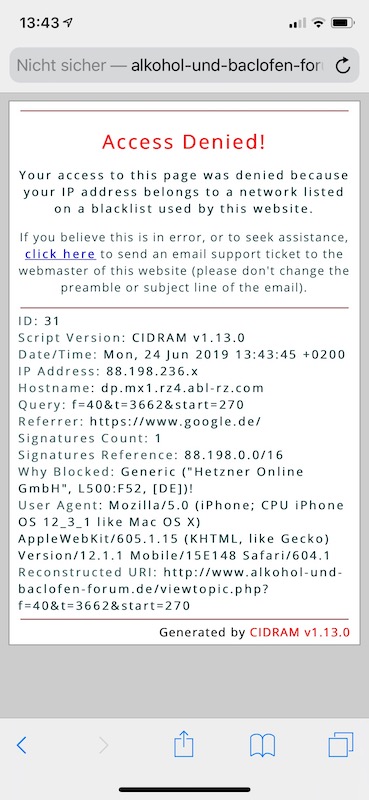 Frau hat D2 (Drillisch). Und das ist eine serverseitige Sperre. CIDRAM ist ein Schutz vor Spammern, warum der überhaupt beim Lesen anschlägt verwundert mich aber, eigentlich sollte der maximal beim Posten aktiv werden.