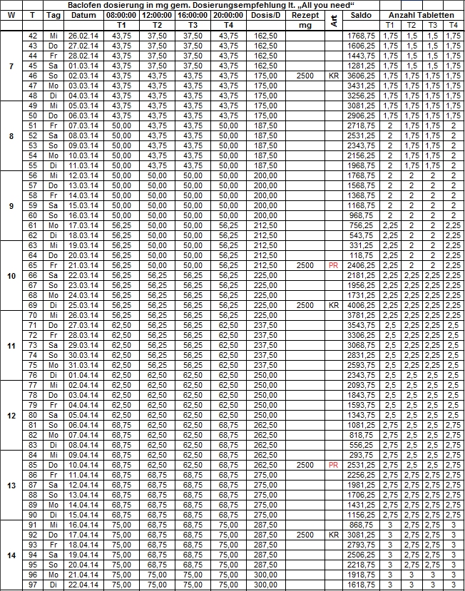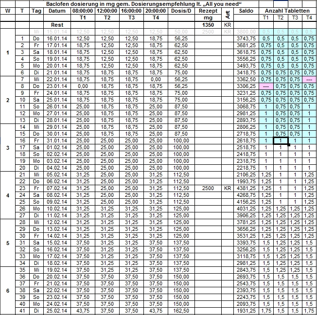 Da ich in den letzten jahren mit Dosierungssprüngen experimentiert habe und dabei wenig erfolgreich war, habe ich längere Zeit eine konstante Dosis von 4 x 12,5 mg je 4h eingenommen. Damit bin ich bisher gut gefahren und die NW waren gering: gegen 16-17 Uhr leichte Müdigkeit, die aber schnell verflog. Ansonsten mehr oder weniger Ohrengegäüsche, die m.E. von der Flüßigkeitszufuhr abhängig sind. Da ich meinem Ziel "der absoluten Gleichgültigkeit dem Akohol gegenüber" noch weit entfernt bin, habe ich mir einen Hochdosierungsplan erstellt, der sich grob an die Dosierungstabelle lt. "All you need" orientiert. Achtung! Dies ist ein Selbstversuch und keine allgemeine Anleitung!Da mein Kassenrezept für dieses Vorhaben langfristig nicht ausreicht, mußte ich sicherstellen, dass der steigende Bedarf an Baclofen gesichert ist um den Plan durchführen zu können. In den Folgenden Tabellen erscheinen die Abkürzungen KR=Kassenrezept und PR=Privatrezept. Um dieses "Open End" Projekt durchführen zu können, habe ich für einen ausreichenden Vorrat aus zuverlässigen Quellen gesorgt Dateianhang: